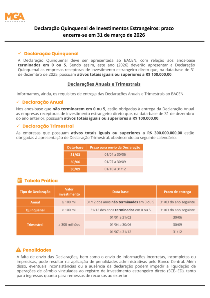 Declaração Quinquenal de Investimentos Estrangeiros: prazo encerra-se em 31 de março de 2026