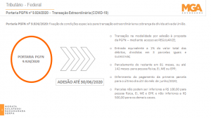 Portarias da PGFN que regulamentam a transação tributária (Portaria PGFN 9917/2020) e a transação tributária extraordinária pelo Covid-19 (Portaria PGFN 9924/2020).